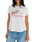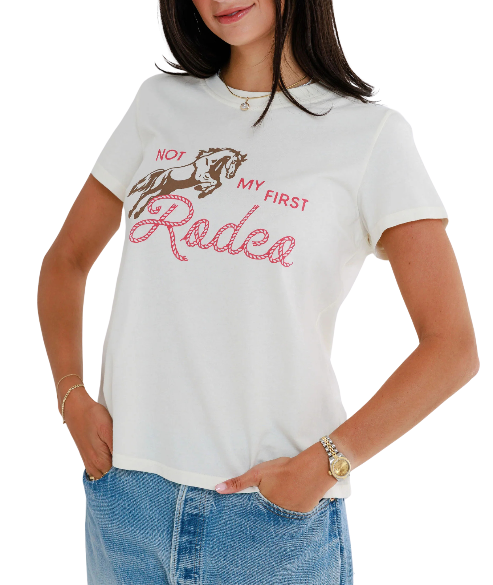 Strut your stuff in this sassy "Not My First Rodeo" crew that's engineered for the perfect fit. With its flattering femme cut and playful graphic, this tee shirt celebrates your wisdom, experience, and unshakeable confidence. Soft enough for lounging but stylish enough to turn heads, this crew strikes the ideal balance between comfort and sass. Slip it on and instantly feel like the seasoned, fabulous woman you are—ready to take on the world with humor, grace, and impeccable style.